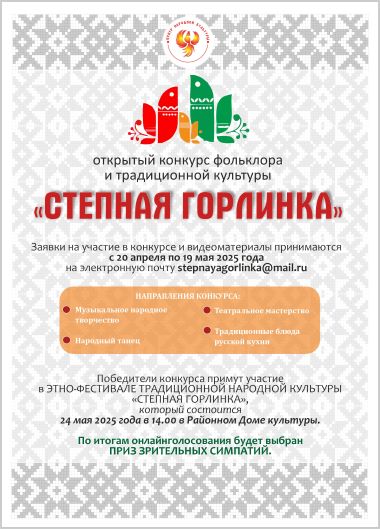 — Прием заявок и видеоматериалов конкурсных выступлений осуществляется с 20 апреляпо 19 мая 2025 года на электронную почту stepnayagorlinka@mail.ru